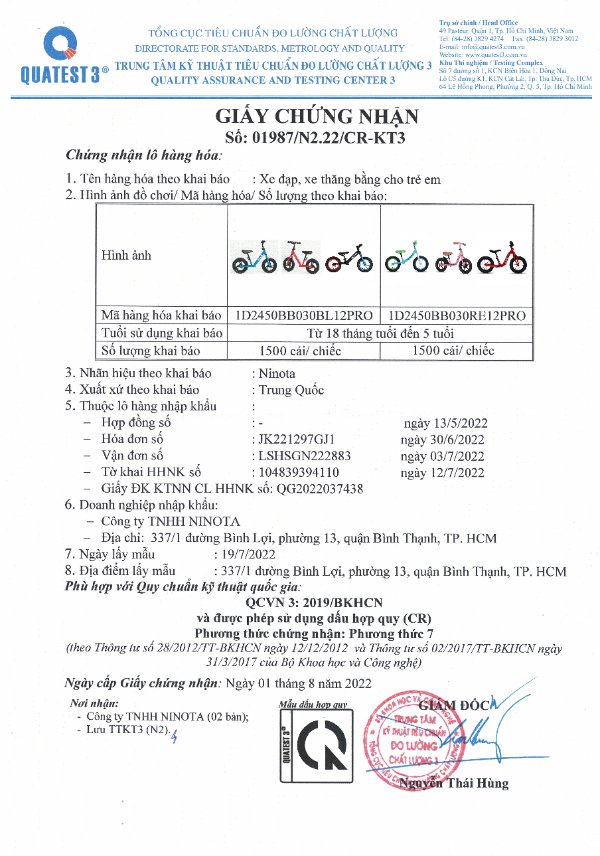 Tất các các sản phẩm của Ninota đều được kiểm nghiệm và cấp giấy chứng nhận chất lượng và an toàn bởi Trung tâm Kỹ thuật Tiêu Chuẩn Đo lường Chất lượng 3 (QUATEST 3).